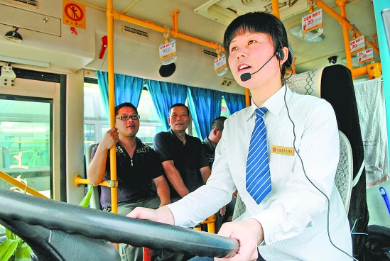 6月2日,金华市区K8路公交车班长程晋玲在上班驾车时首次佩戴上微型耳麦,尝试戴耳麦服务,以解决老年乘客及后排乘客不能清楚听到驾驶员服务语言的问题。金华日报记者 胡肖飞 摄