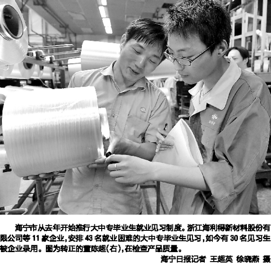 | 海宁市从去年开始推行大中专毕业生就业见习制度。浙江海利得新材料股份有限公司等11家企业,安排43名就业困难的大中专毕业生见习,如今有30名见习生被企业录用。图为转正的董陈超(右),在检查产品质量。 海宁日报记者 王超英 徐晓燕 摄 |