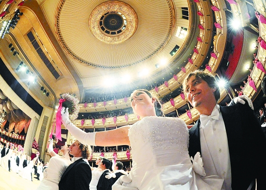 同维也纳新年音乐会、西班牙骑术学校并称为奥地利“三大国宝”的维也纳歌剧院舞会每年举行一次。图为盛装男女参加歌剧院舞会。
