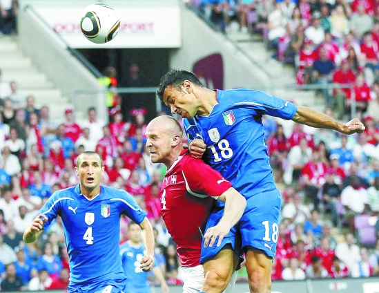 6月5日,意大利队球员夸利亚雷拉(右)与瑞士队球员森德罗斯争顶。当日,在瑞士日内瓦举行的一场国际热身赛中,意大利队以1比1战平瑞士队。 新华社发