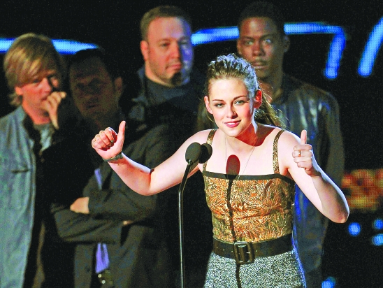 6月6日,在美国洛杉矶,出演《暮光之城2:新月》的女演员克里斯汀·斯图尔特获得2010年度美国MTV电影奖最佳女主角奖后发表获奖感言。 新华社发