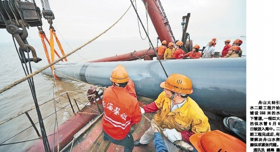 舟山大陆引水二期工程开始铺设288米的水下管道,一根巨大的供水管6月6日被放入海中。二期工程完成后,有望解决舟山水资源供求紧张问题。