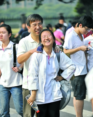 | 在杭州学军中学考点门口,一位家长正在给上考场前的女儿作肩膀按摩,希望女儿能放松身心,减轻压力。本报记者 吴元峰 摄 |
