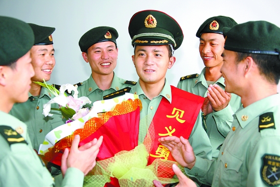 战友们欢迎纪晓飞载誉归来。 通讯员 张涛 摄