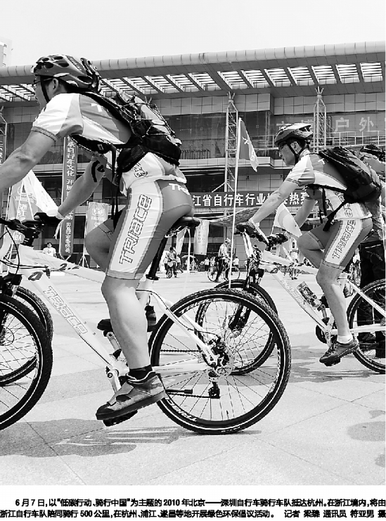 6月7日,以“低碳行动、骑行中国”为主题的2010年北京——深圳自行车骑行车队抵达杭州。在浙江境内,将由浙江自行车队陪同骑行500公里,在杭州、浦江、遂昌等地开展绿色环保倡议活动。记者 梁臻 通讯员 符亚男 摄