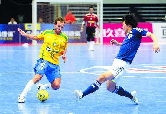 6月9日,第二届中国室内五人制足球国际锦标赛在杭州黄龙体育馆进入第2天赛事,巴西队以9比2的比分战胜了日本队。图为比赛现场。