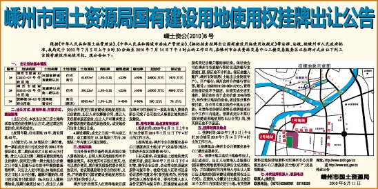 根据《中华人民共和国土地管理法》、《中华人民共和国城市房地产管理法》、《招标拍卖挂牌出让国有建设用地使用权规定》等法律、法规,经嵊州市人民政府批准,我局定于2010年7月5日上午8时30分始至2010年7月14日下午4时止的工作日内,在嵊州市公共资源交易中心三楼交易服务区以挂牌方式出让下列三宗国有建设用地使用权。现公告如下: