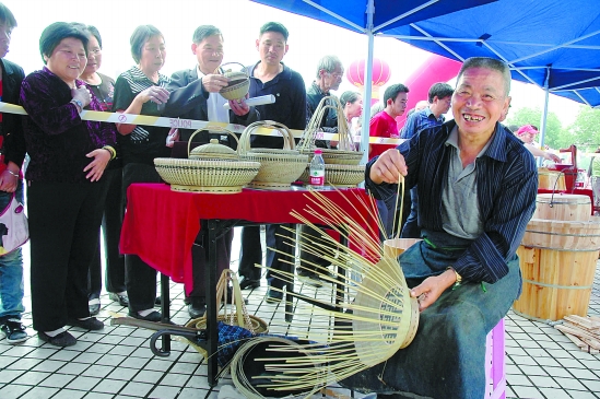 10日,永康市举行第五个“文化遗产日”,一批老艺人“重出江湖”,磨剪刀、钉秤、锡雕、打铜、打金、箍桶等手工绝活纷纷亮相。图为73岁的老篾匠施宝树娴熟地编织着竹篮。 记者 徐贤飞 报道组 叶宁 谭孝军 摄