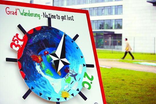 图为一幅警告气候变暖的海报竖立在会场外。新华社记者 罗欢欢 摄