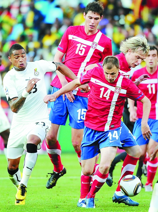 6月13日,塞尔维亚队球员米兰·约万诺维奇(前)在比赛中带球突破。当日,在茨瓦内举行的D组比赛中,塞尔维亚队0比1不敌加纳队。新华社发