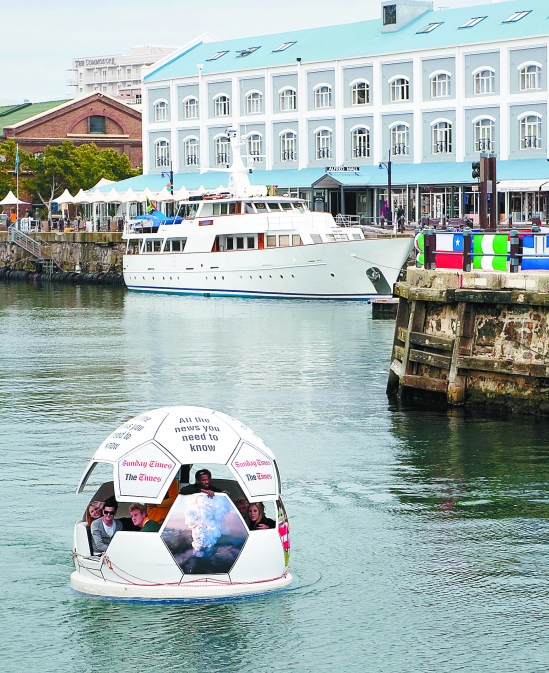 6月12日,“足球船”在维多利亚港湾中穿行。在开普敦的旅游胜地维多利亚湾,一艘足球造型的游船成为游客们的最爱,它一次可以载6至8名游客。