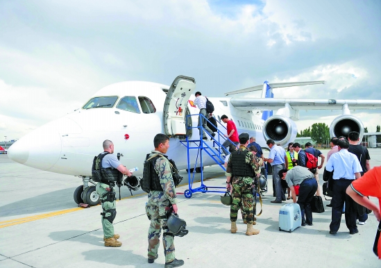 6月14日,在吉尔吉斯斯坦首都比什凯克,中方工作组成员在比什凯克国际机场登机。 新华社记者 沙达提 摄