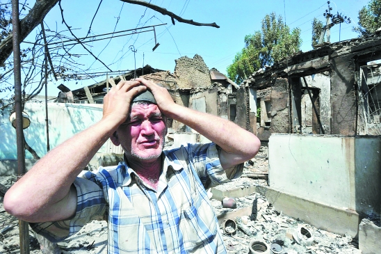 6月14日,在吉尔吉斯斯坦南部城市奥什,一名男子站在自己被毁的房屋旁。 新华社发