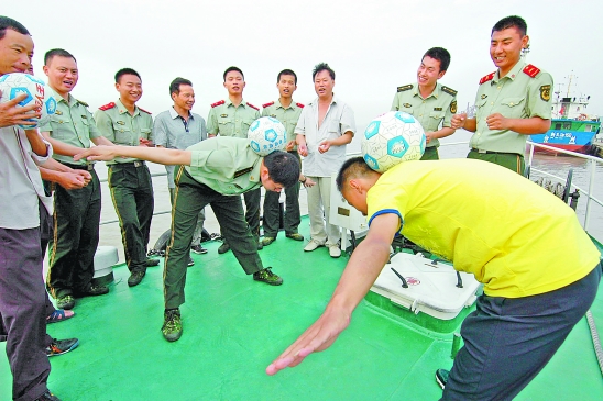 世界杯开幕后,温州边防支队船艇大队官兵利用执勤间隙,与驻地渔民开展“甲板足球乐”警民联欢活动,共享南非世界杯的火热激情。通讯员 吴水斌 摄