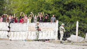| 6月14日,吉尔吉斯斯坦难民在吉尔吉斯斯坦和乌兹别克斯坦边界的吉方一侧挥手叫喊。 新华社记者 董龙江 摄 |