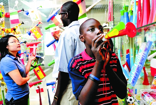 6月15日,南非世界杯足球赛正如火如荼进行,义乌小商品市场内,国旗、假发、喇叭、头巾、荧光棒等球迷拉拉队用品持续热销。