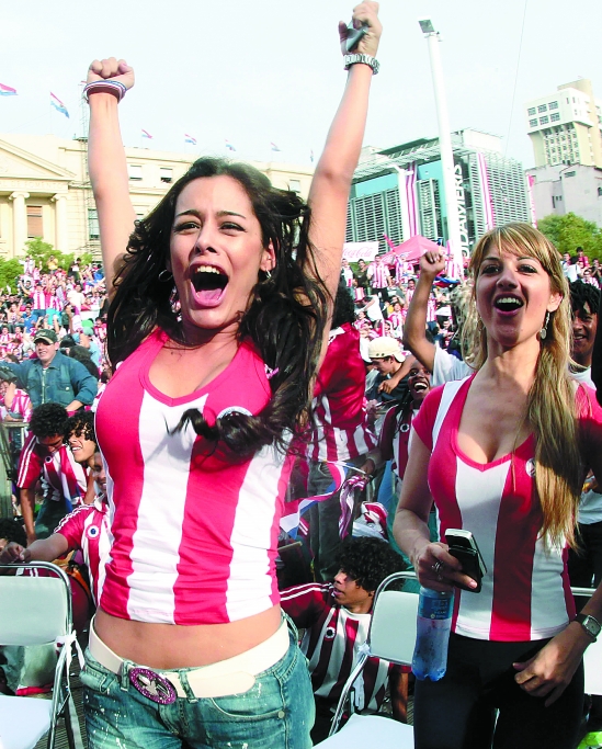 6月14日,在巴拉圭首都亚松森,两位女球迷看到本队进球后兴奋不已。