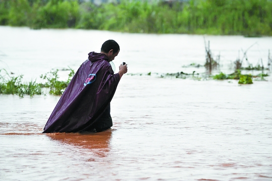 村民在洪水中跋涉。新华社发(黄赞福 摄)