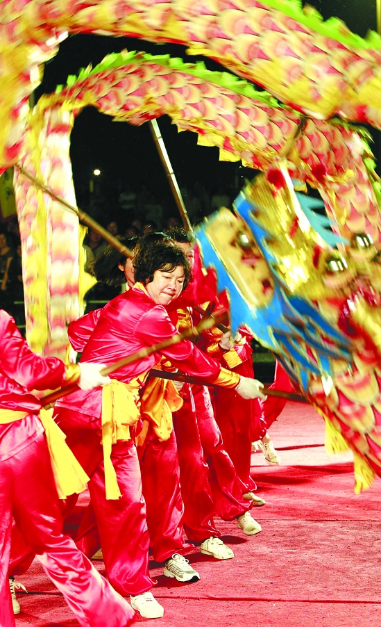 6月17日晚,刚开始伏休的岱山渔民举行盛大的民俗文化巡游活动。图为女子舞龙。