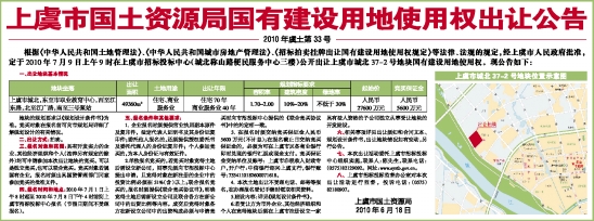 根据《中华人民共和国土地管理法》、《中华人民共和国城市房地产管理法》、《招标拍卖挂牌出让国有建设用地使用权规定》等法律、法规的规定,经上虞市人民政府批准,定于2010年7月9日上午9时在上虞市招标投标中心(城北称山路便民服务中心三楼)公开出让上虞市城北37-2号地块国有建设用地使用权。现公告如下: