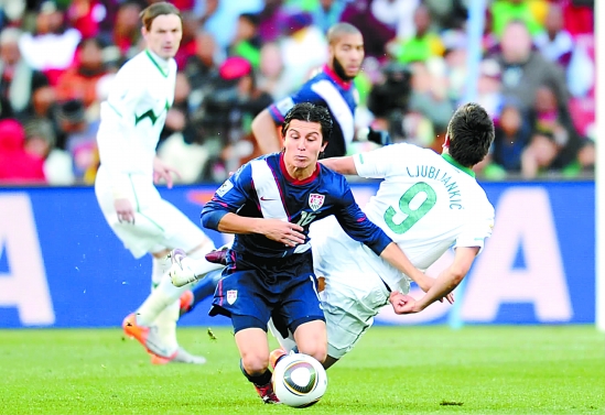 6月18日,美国队球员托雷斯(中)与斯洛文尼亚队球员柳比扬基奇(右一)拼抢。 新华社发