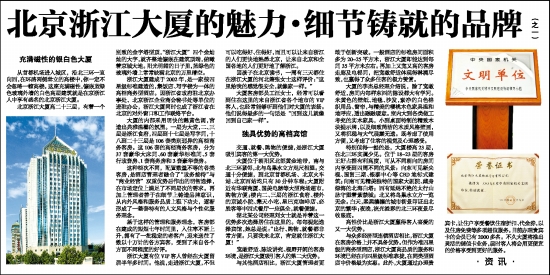 从首都机场进入城区,沿北三环一直向西,在环路两侧耸立的高楼中,你一定不会忽略一幢高楼。这座充满磁性,镶嵌蓝绿色玻璃外墙的白色高层建筑就是在京浙江人中享有盛名的北京浙江大厦。