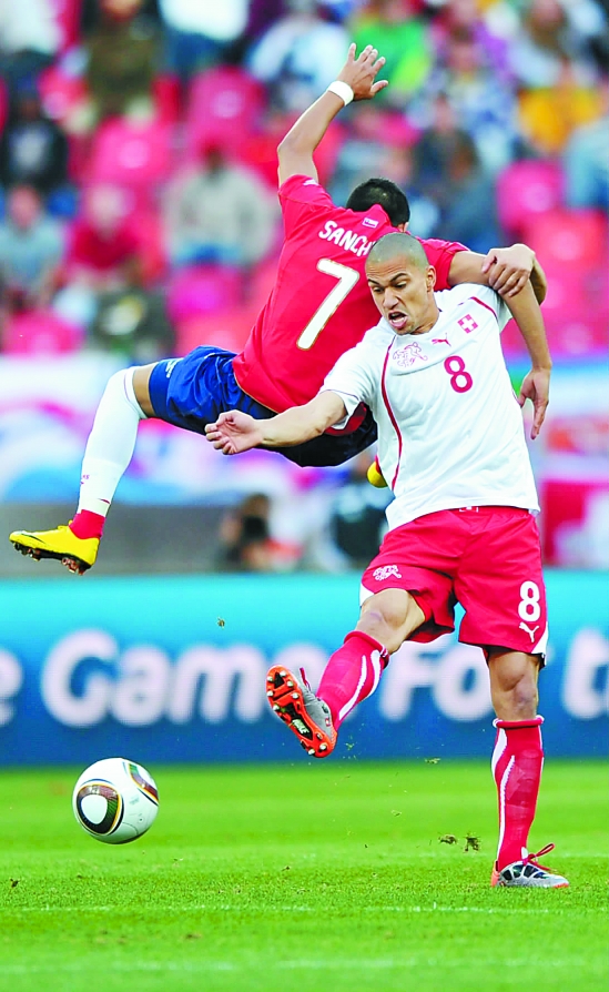 6月21日,智利队球员阿·桑切斯(上)与瑞士队球员格·因勒争顶。当日,在H组的比赛中,智利队以1比0小胜瑞士队。