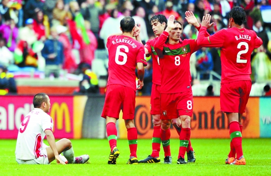 6月21日,朝鲜队球员郑大世(左一)在比赛后坐在地上。当日,在开普敦举行的G组第二轮比赛中,朝鲜队以0比7不敌葡萄牙队。新华社记者 徐速绘 摄