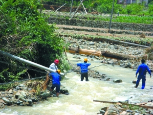 近日,丽水龙泉、莲都等县市区也遭遇了不同程度的暴雨山洪袭击,部分区域公路良田被冲,供水供电中断,移动通信设施遭受严重破坏。中国移动丽水分公司积极组织人员赶往现场抢修排障,为当地群众提供通信保障。抢修队员趟泥石流,爬险坡,3个小时后终于来到光缆障碍处。眼前的灾情让抢险人员不堪入目:昔日仅10余米宽的河床,如今浊浪翻滚,被洪水冲断的光缆被庄稼、杂草缠绕在洪水中左右摆荡。