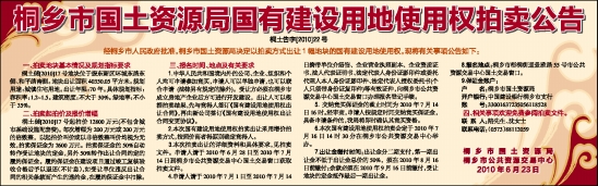 6.本次国有建设用地使用权拍卖会定于2010年7月16日14时30分在桐乡市公共资源交易中心举办。