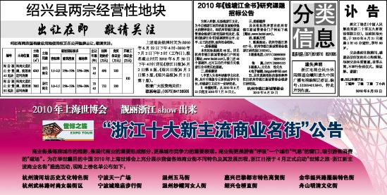 上述地块挂牌时间为:2010年6月22日下午4时~2010年7月2日下午3时(工作日),报名截止时间2010年6月30日下午4时(详见《浙江日报》6月2日第8版、《绍兴日报》6月2日第3版,《绍兴县报》6月2日第7版)。