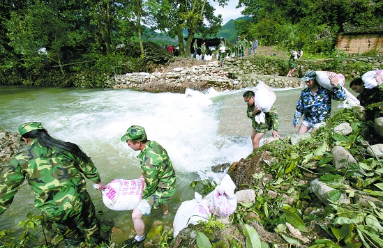 昨天,在龙泉溪头村被冲垮的后洋溪堤岸,应急小分队垒起沙包。官伟 颜伟杰 摄