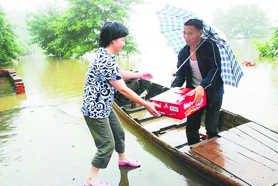 兰溪市赤溪街道插口村,村干部划船挨家挨户给受困村民送去矿泉水和方便面。徐宪忠 金雪琼 摄