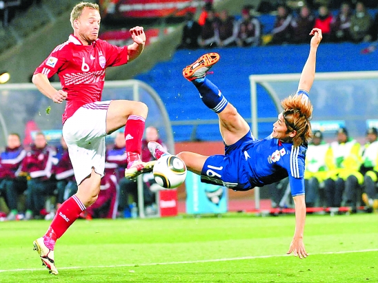 6月24日,日本队球员大久保嘉人(右)与丹麦队球员雅各布森在比赛中拼抢。新华社记者 徐速绘 摄