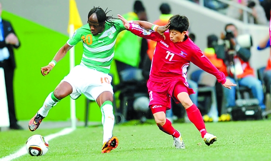 6月25日,朝鲜队球员文仁国与科特迪瓦队球员热尔维尼奥(左)拼抢。当日,在世界杯G组最后一轮比赛中,朝鲜队0比3负于科特迪瓦队。