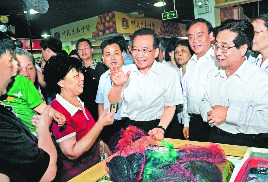 温家宝在杭州东山农贸市场考察群众的菜篮子问题。 本报记者 黄曙林 摄