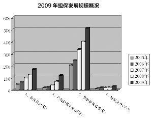 1.截至2009年底,累计担保企业户数123271户,其中本年30182户;累计担保笔数260274笔,其中本年58877笔;累计担保总额20052489万元,其中本年5123122万元。在保企业户数26767户,担保责任余额4057135万元。