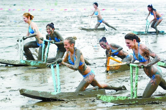 6月28日,参加2010舟山群岛·新丝路国际海洋小姐大赛的各国佳丽,在岱山县秀山岛参加滑泥大赛、泥中拔河等活动。本报记者 钟昊 报道组 赵红泽 杨岱斌 摄