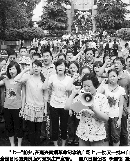 “七一”前夕,在嘉兴南湖革命纪念馆广场上,一批又一批来自全国各地的党员面对党旗庄严宣誓。嘉兴日报记者 李剑铭 摄