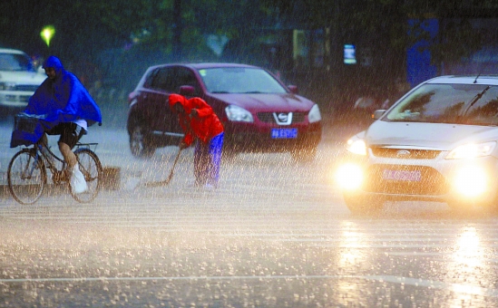 昨天早晨,杭城暴雨不止,一些道路积水严重,环卫工人冒雨清扫。