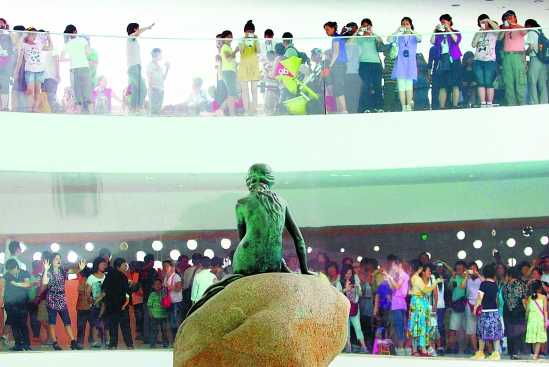6月29日,上海世博会迎来了丹麦国家馆日。一睹丹麦著名雕塑小美人鱼的游客络绎不绝。 本报记者 吴新燕 摄影报道