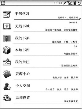 据中国移动浙江公司技术人员介绍,G3阅读器有8个板块,分别是“干部学习”、“无线书城”、“我的书架”、 “本地书库”、“我的批注”、“资源中心”、“个人空间”、“系统设置”。