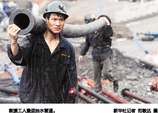 救援工人搬运抽水管道。 新华社记者 范敏达 摄