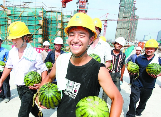 昨日,宁波住宅建设集团的200多名工人领到了清凉药、毛巾、饮料和西瓜等消暑物品。