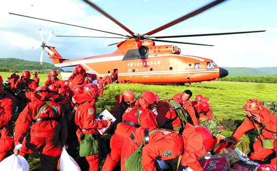 | 7月1日,在黑龙江大兴安岭呼中地区的救火部队集结点,MI-26TC直升机向火场运送兵力。当日下午,一架刚刚转场赶到黑龙江大兴安岭呼中地区的目前世界上载重量最大的直升机——MI-26TC直升机,落地不久就接到指挥部命令,前往附近的救火部队集结点,运载近百名官兵和数十吨给养用品飞赴灾情最重的燃火区。包括这架MI-26TC重型直升机在内,目前参与大兴安岭森林火灾扑救工作的直升机总数已达7架。 新华社发(牟健为 摄) |