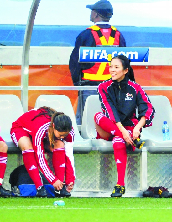 7月3日,中国演员章子怡(右)在世界杯四分之一决赛德国队与阿根廷队比赛前的一场慈善赛中。 新华社记者 杨磊 摄