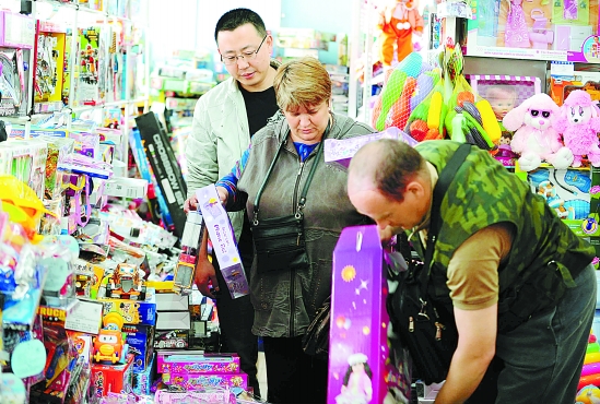 中俄作为新兴经济体中的两支重要力量,彼此间的贸易额也增势喜人。图为6月9日,两名俄罗斯客商在中国内蒙古满洲里互贸区挑选商品。