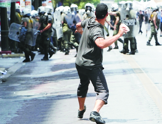 债务危机的阴霾尚未在欧洲上空散去,6月29日,希腊再次爆发全国性大罢工。图为抗议者向防暴警察投掷石块。