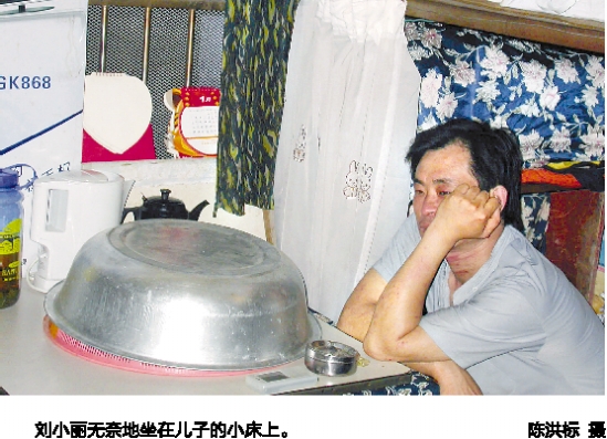 刘小丽无奈地坐在儿子的小床上。陈洪标 摄