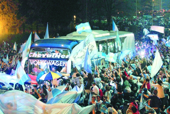 7月4日,上万名阿根廷球迷聚集在阿根廷足协总部门口,迎接征战南非世界杯的阿根廷国家队回家。阿根廷队在四分之一决赛中负于德国队。 新华社发